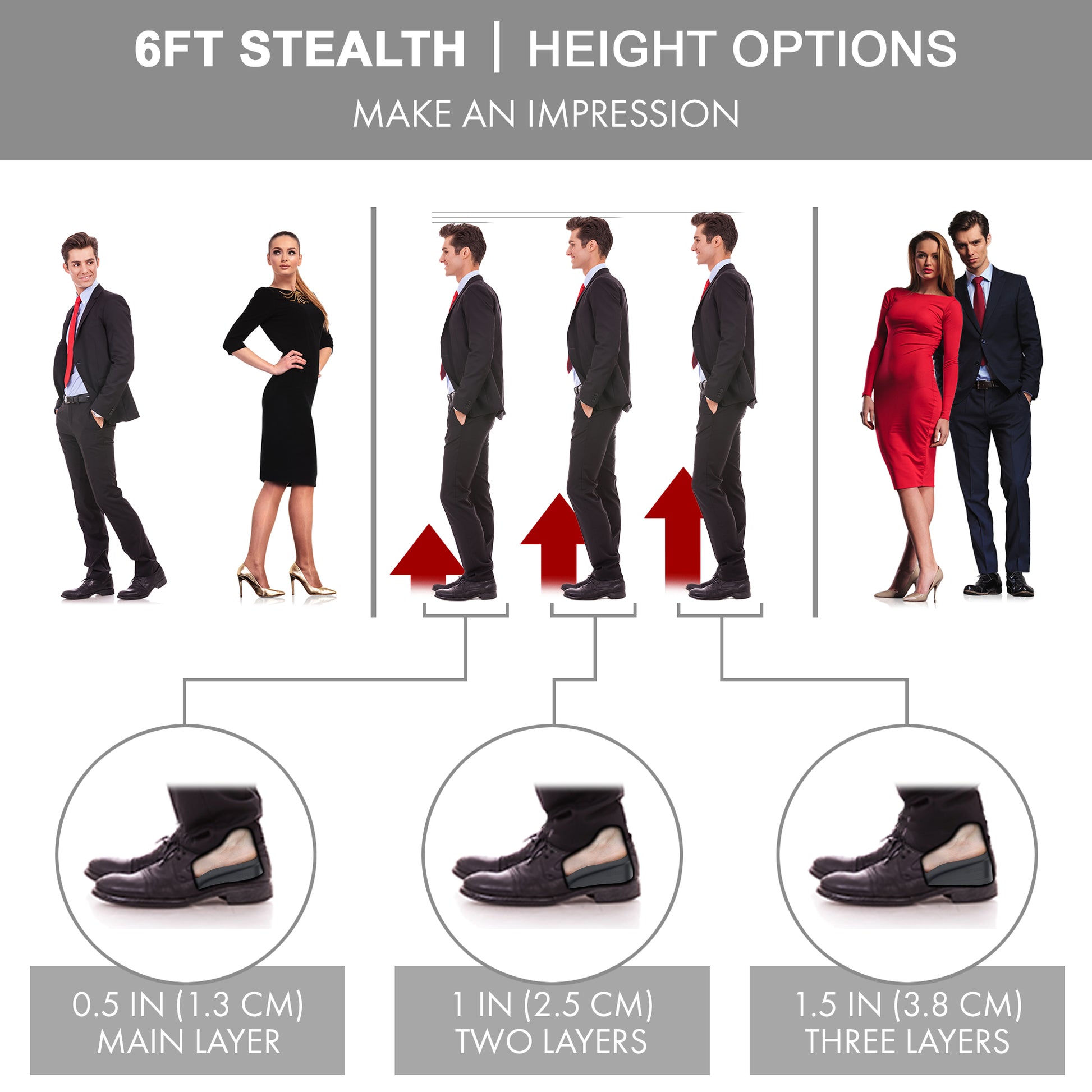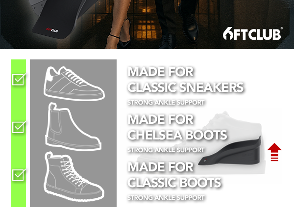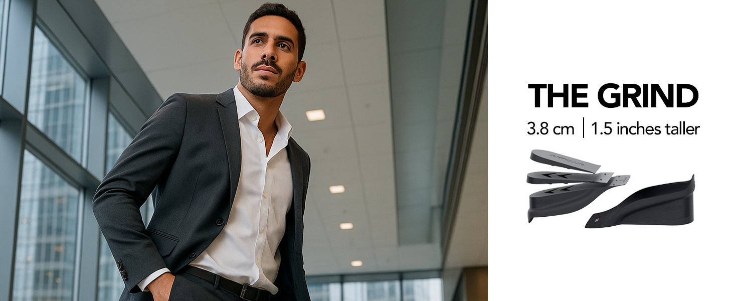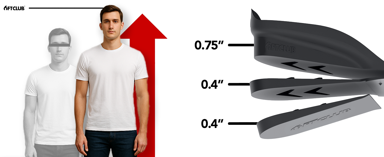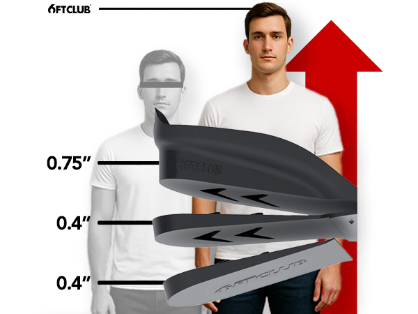 Elevate your confidence with 6FT CLUB's adjustable insoles. Add 1 inch, 2 inches, or 2.5 inches in height.