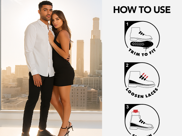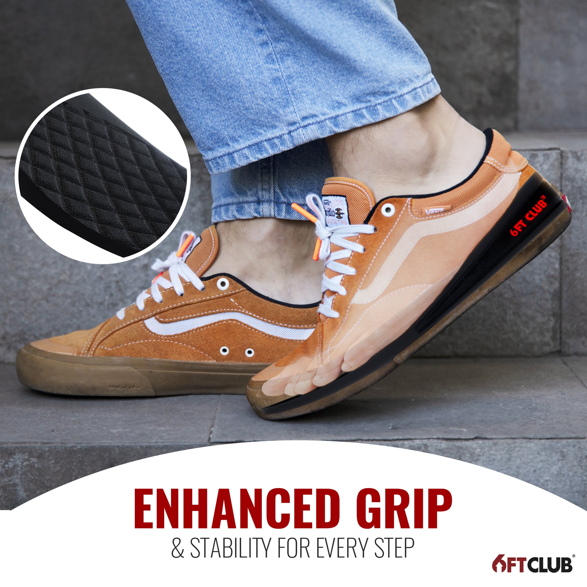 Get taller in seconds. Trim the elevation soles to size (if needed), loosen the shoe laces, slide your foot in, and enjoy the benefits of instant height. Stand 1.25 inches (3.2 cm) taller. With anti-slip treading and a wide foot base, your shoe lifts and feet won’t slide around while walking. Completely undetectable in recommended mid-tops, high-ankle support shoes, or boots (ideally with laces); not recommended for low-tops.